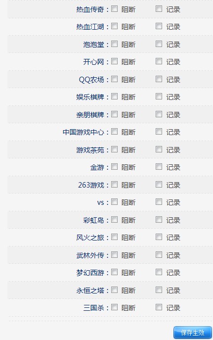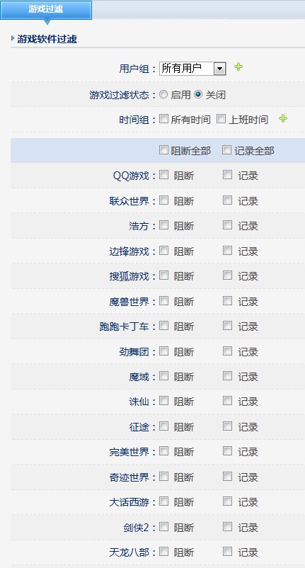 支持主流游戲基于用戶組、時間段的過濾,您可以設置不同用戶組的不同權限。實現此項功能,必須啟用游戲過濾狀態。