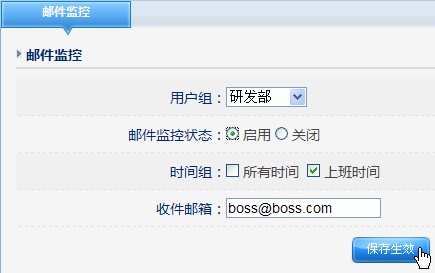 選擇您要監控的用戶組,并啟用郵件監控狀態,選擇時間后,填寫您或老板的郵箱地址,點擊保存。之后指定用戶使用Foxmail發送的E-mail將會復制一份到指定郵箱。