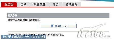 重啟動:單擊“重啟動”按鈕將使設備重新啟動。設備重啟不會導致設置信息丟失,但是在重啟動期間,當前已建立的網絡連接會暫時中斷。