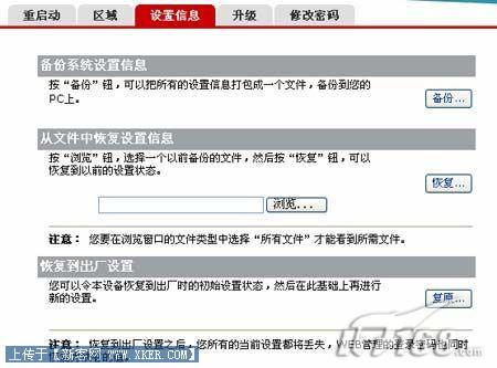 設置信息:該功能可以將路由器的配置進行備份到電腦硬盤,并且在需要時進行恢復,也可以將路由器恢復至出廠設置。