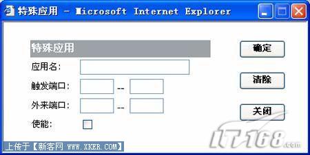 非凡應用:局域網內主機通過觸發端口與外部網絡建立連接后,其相應的外來端口也將被打開,這時外部網絡的計算機可以通過這些端口來訪問局域網。通過非凡應用,觸發外來端口的打開。WBR204g 最多可以設置 10 個非凡應用。