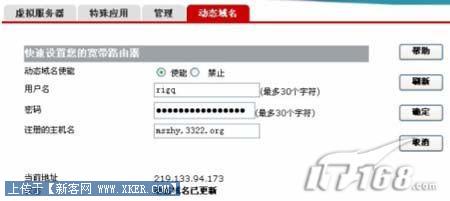 動態域名:使用動態域名可以讓Internet 上的用戶仍可以通過域名訪問WBR204g無線路由器。要想啟用該功能,用戶必須自己申請動態域名。
