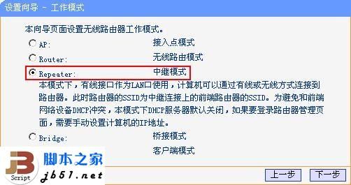 3、點擊下一步開始設(shè)置,彈出無線工作模式設(shè)置頁面。