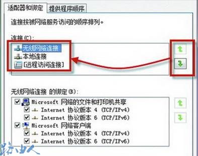 三、首先右擊系統(tǒng)托盤中的寬帶連接,選擇打開網(wǎng)絡(luò)和共享中心,在打開的網(wǎng)絡(luò)和共享中心窗口中,單擊該窗口左側(cè)的更改適配器設(shè)置,打開網(wǎng)絡(luò)連接窗口,按下Alt快捷鍵,調(diào)出菜單欄,單擊菜單高級(jí)-高級(jí)設(shè)置,打開高級(jí)設(shè)置中的配器和綁定,最后在該選項(xiàng)卡中,選中本地連接,單擊右邊的綠色箭頭,把本地連接調(diào)前到無線網(wǎng)絡(luò)連接之前,單擊確定即可。