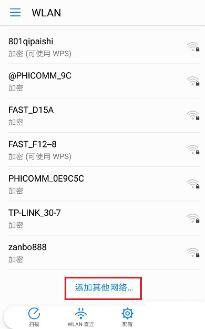 1、在手機連接wifi的頁面中,打開 “其它...”、“添加其它網絡” 或者類似的名稱,如下圖所示。