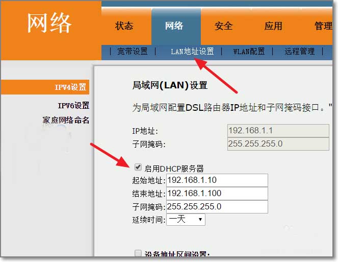 6、接下來是DHCP服務器設置。如圖點擊Lan地址設置,啟用DHCP服務器,設置自動獲取IP地址的范圍。然后保存。