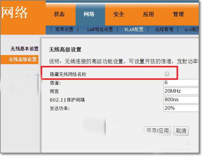 8、若為了Wifi安全,可以點擊無線高級設置,可以Wifi的名稱隱藏,手機等設備就無法搜索到這個Wifi了,只有知道這個Wifi名字和密碼的用戶,手動輸入Wifi名字和密碼才能連接。若將光貓只做為Modem連接到另外的路由器,則在寬帶設置連接模式選擇橋接。而不是路由。