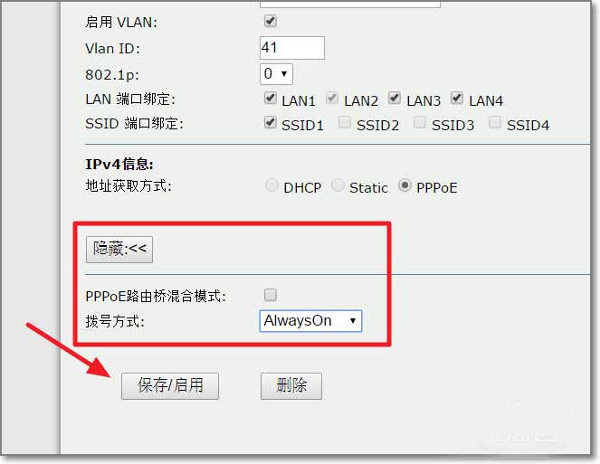 5、點擊下面的高級,這里可以設置撥號方式,一般設置為總是保持寬帶連接AlwaysOn,不用斷開。點擊保存,這樣就完成了撥號設置。可以看看是否撥號成功。