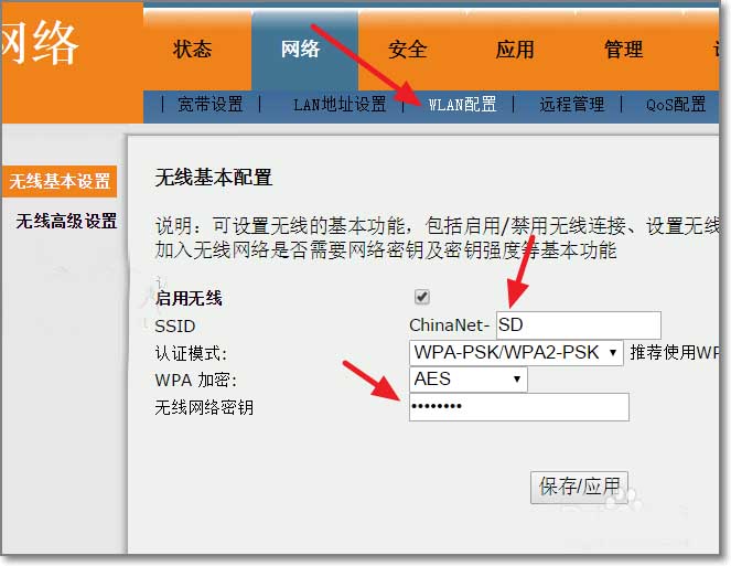 7、然后設置無線WIFI,點擊Wlan配置-無線基本設置,啟用無線,設置無線的SSID名稱,這里郁悶的是光貓強制了Wifi名稱的前綴為ChinaNet,最后設置一個復雜一點的Wifi密碼。