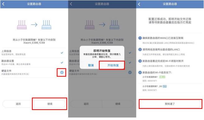當系統分別連接新舊兩臺設備后,需要選擇新小米路由器HD需要恢復的數據,其中上網的信息和路由器的基礎設置為必選項,硬盤內的文件可以自由選擇是否需要恢復,選擇完成后點擊繼續,確認開始恢復就可以了,在數據遷移前系統需要人工完成對路由器的一些必要設置。