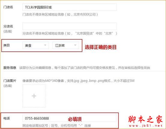 B.選擇正確的“類目”,并填入正確的門店“電話”