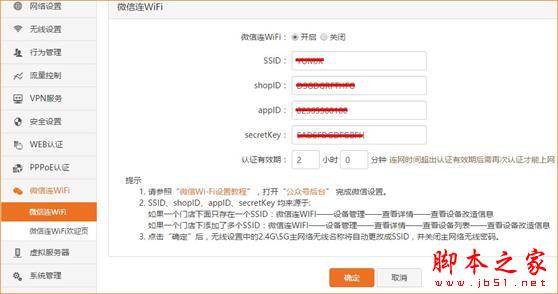 ③開啟“微信連WIFI功能”,并把相應(yīng)的信息填上去,并設(shè)置“認(rèn)證有效時(shí)間”。