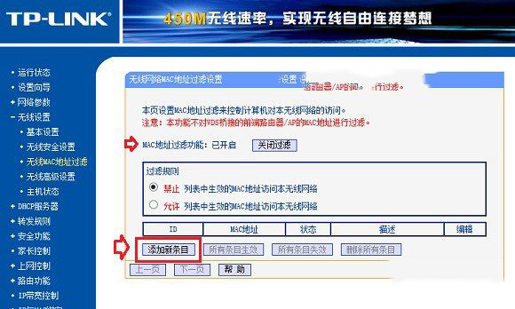 在路由器的【無線設置】中,點擊進入【無線MAC地址】設置,然后先開啟【MAC地址過濾】功能,然后將自家的電腦MAC地址或者手機MAC地址添加一一添加進來綁定,然后保存。