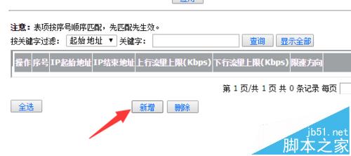 6、從彈出的新界面中,即可設(shè)置要限速的IP地址范圍,同時(shí)設(shè)置“限速方向”以及“上行流量”和“下行流量”,點(diǎn)擊“新增”按鈕即可完成相關(guān)限速規(guī)則的添加操作。