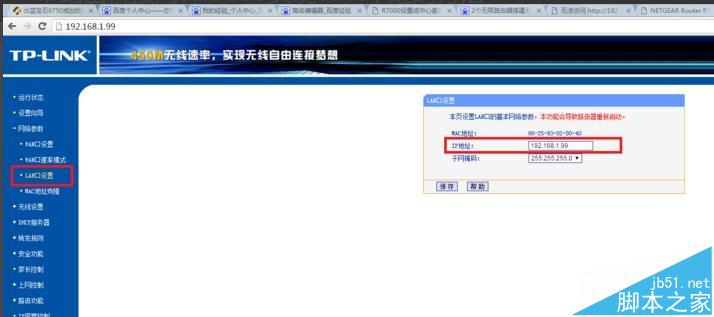 2、進入tp路由器lan口設(shè)置界面,設(shè)置不同的路由ip確保不與主路由等網(wǎng)絡(luò)設(shè)備發(fā)生ip沖突。