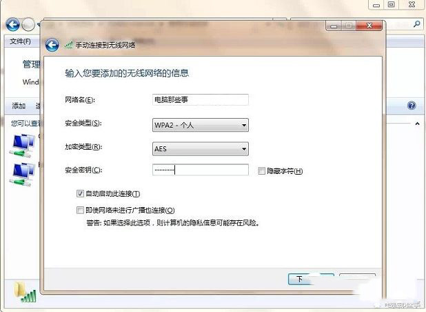 六、依次輸入你的路由器創建的網絡名,安全類型 加密類型 和安全密鑰即WIFI密碼點擊下一步即可,如圖。