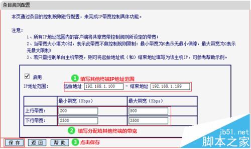 點擊“增加新的條目”——>“起始地址”和“結束地址”分別填寫:192.168.1.100 和 192.168.1.199——>上行最小帶寬為:200,最大帶寬為:500——>設置下行帶寬最小為:2500,最大帶寬為:3500——>設置完成點擊“保存”。