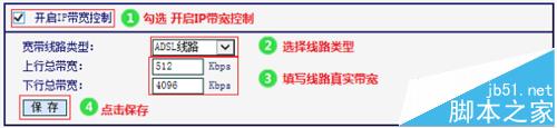 點擊“IP寬帶控制”——>勾選“開啟IP寬帶可能工作”選項——>設置“寬帶線路”、“上行總寬帶”、“下行總寬帶”——>點擊“保存”。