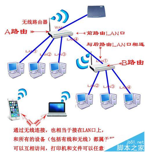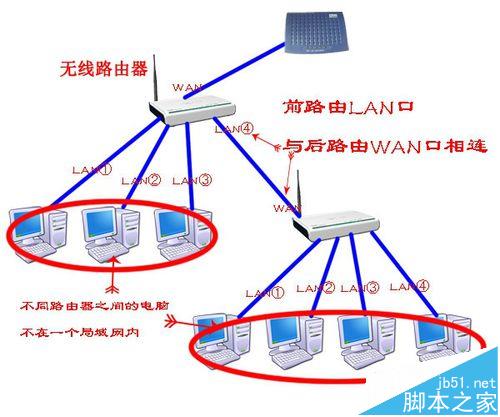 4、有些人手頭上路由器有好幾個,就是沒有交換機,為了省點錢,就想用路由器代替交換機,擴展電腦數(shù)量。那也容易,有兩種方案。方案一,后路由器的WAN接口與前路由器的LAN接口相連。這種接法就把7臺電腦分成了兩個局域網(wǎng),不同局域網(wǎng)的電腦互相之間不能訪問。一臺電腦就無法把文件或者打印機共享給所有的電腦了。那有沒有辦法讓兩個路由器所連的電腦同屬于一個局域網(wǎng)呢?答案是可以的。要用到方案二。