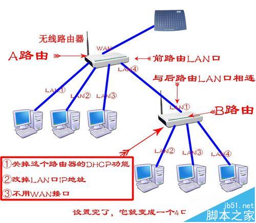 5、方案二:只用B路由器的LAN口,WAN口不用。路由器中的4個LAN口本來就是一個交換機。但每個路由器都帶有DHCP自動分配地址的功能,為了防止沖突,必須關(guān)掉一個。另外,路由器的LAN口一般默認(rèn)都是192.168.1.1,現(xiàn)在兩個路由器的LAN口都接在一起了,要想不沖突,必須改掉。設(shè)置完成B路由器后,就可以把它當(dāng)成交換機用了,它所連的電腦和A路由器所連的電腦同在一個局域網(wǎng)內(nèi),可以互相訪問。