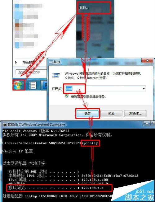 7、電腦用網(wǎng)線連在路由器的LAN口上,訪問路由器就是用LAN口的IP地址,剛買來的路由器一般都是192.168.1.1。如果修改過,可以到cmd命令提示符窗口下,輸入ipconfig查找“默認(rèn)網(wǎng)關(guān)”,“默認(rèn)網(wǎng)關(guān)”即是“LAN口的IP地址”,“LAN口的IP地址”即是“默認(rèn)網(wǎng)關(guān)”。