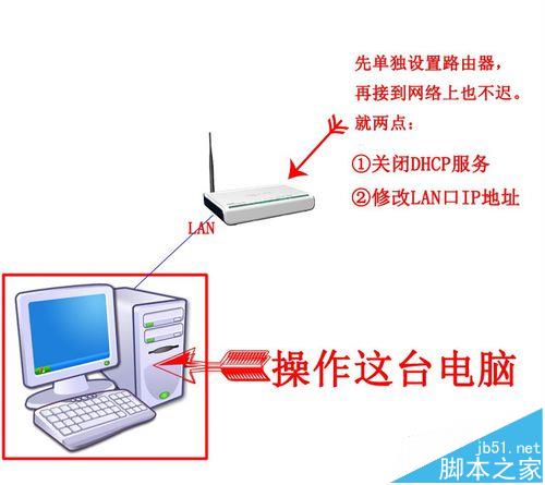 6、把路由器設(shè)置成交換機,最好就不要先連到網(wǎng)絡(luò)上再設(shè)置,因為IP沖突有可能導(dǎo)致登錄不了路由器。單獨用一臺電腦,用網(wǎng)線連到路由器的LAN口上,就可以登錄路由器修改LAN口IP地址和關(guān)閉DHCP服務(wù)了。