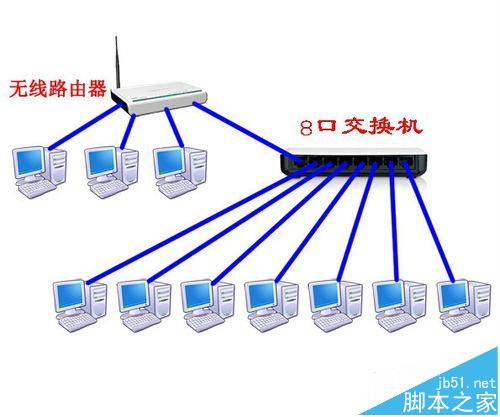 3、可是有些人說,我的公司的電腦不只4臺呀?那怎么辦呢?稍微懂點的人馬上會想到,加個8口或是16口的交換機,愛接多少臺電腦就接多少臺電腦,連接的方式也相當(dāng)容易,騰出一個路由器的LAN口與交換機相接,交換機的其它接口就可以隨便用了。實際上,路由器的4個LAN口本質(zhì)上就是一個4口交換機,我們所使用的路由器,是路由器與交換機的結(jié)合,只不過交換接口就只有4個而已。交換機所連的所有電腦同屬于一個局域網(wǎng)下,電腦之間可以互相訪問。