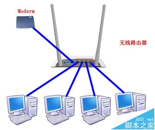 2、因為路由器的網(wǎng)線接口就5個,1個WAN接口,接外網(wǎng),另外4個LAN接口,分四臺電腦用。