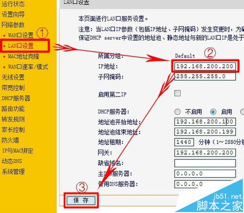 注意:DHCP服務(wù)關(guān)閉后,IP地址修改后,就意味著你的電腦連上這個路由器不能自動獲取到IP地址,要設(shè)置固定IP地址才能登錄路由器。另外電腦的LAN口如果被設(shè)置成192.168.200.200,電腦的IP地址必須設(shè)置成192.168.200.1-192.168.200.254這個范圍內(nèi),才能登錄路由器。