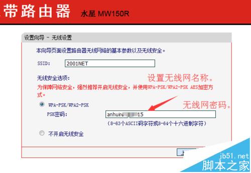 5、點擊下一步,設(shè)置無線網(wǎng)絡(luò)。路由器另外一個功能就是設(shè)置無線網(wǎng)絡(luò)功能,輸入SSID(無線名稱),PSK密碼(登錄無線密碼),如果選擇不開啟無線安全就是無密碼直接上網(wǎng)。