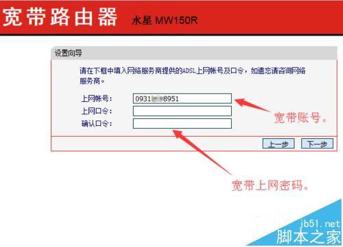 4、輸入上網(wǎng)賬號以及密碼。設(shè)置上網(wǎng)的時候,需要輸入寬帶賬號以及寬帶上網(wǎng)密碼,上網(wǎng)密碼可以通過電信運行商獲取。