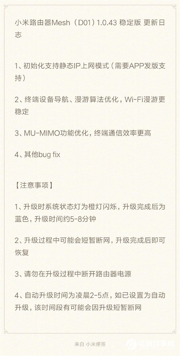 6月13日消息,今天小米路由器Mesh (D01)迎來了OTA推送,正式升級到了v.1.0.43穩(wěn)定版。其他機(jī)型的升級也在努力研發(fā)中,后續(xù)會繼續(xù)和大家同步。