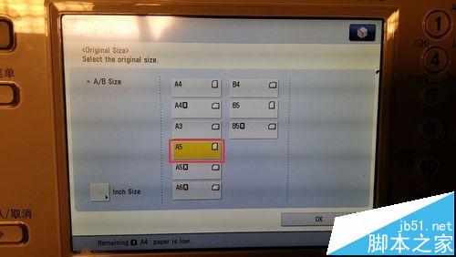 4、改變每次復(fù)印的源紙張大?。阂驗槭菍⒈緛韽?fù)印在兩張紙上的證件正反面復(fù)印在一張紙上,故原紙張大小是A4紙的一半,即A5。所以,點擊A5。然后點擊OK。