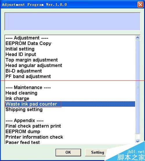 3、選擇好型號和打印機(jī)端口,如下圖,選擇waste ink pnd counter開始進(jìn)入清零操作。