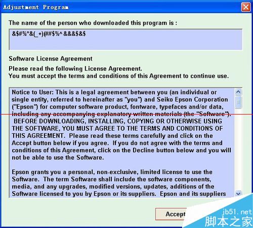 1、這里以EPSON ME35型號的打印機(jī)為列講解一下,打開EPSON 35清零軟件,如下圖所以界面,單擊“ACCEPT”按鈕就受免責(zé)說明。