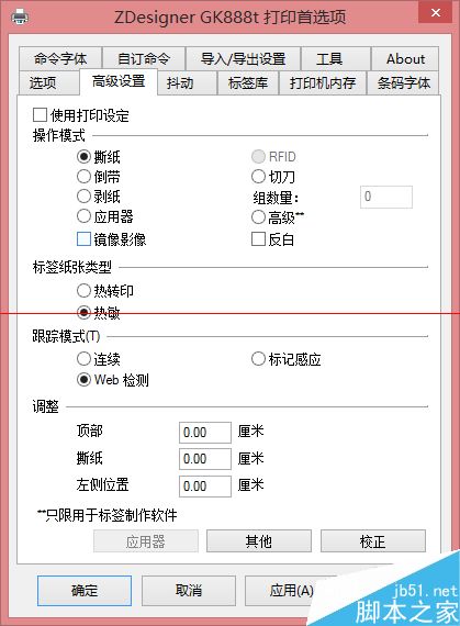 9、點擊“打印首選項”界面的“高級設置”標簽頁,將標簽紙張類型,設置為“熱敏”。點擊“校正”按鈕,打印機會自動出紙,以檢測您的熱敏紙張的大小。等檢測完畢(打印機不再出紙),整個安裝過程就圓滿結束了。