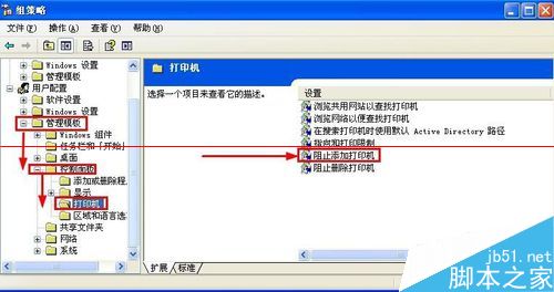 4、然后我們依次點擊管理模版-控制面板-打印機(jī),在右側(cè)雙擊阻止添加打印機(jī)。