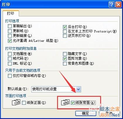 5、單擊“選項(xiàng)”按鈕后,彈出打印選項(xiàng)窗口,在此窗口中勾選“雙面打印選項(xiàng)”中的“紙張背面”選項(xiàng),如圖中所示。