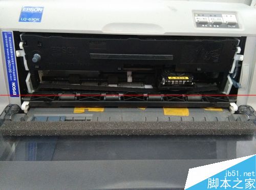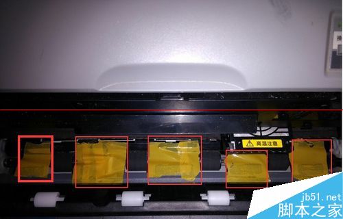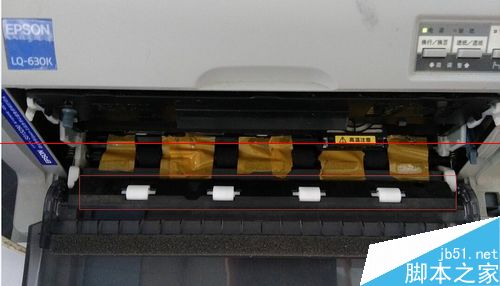 3、在出紙滾軸間粘上透明膠或封口膠,我用的是寬一點(diǎn)的封口膠,別粘到滾軸哦。