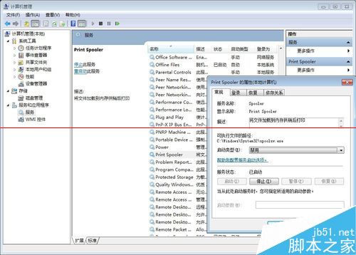 1、請先將 Print Spooler 服務禁用(我的電腦,右鍵“管理”,服務)(選取禁用,并且停止,點擊“確定”退出)。