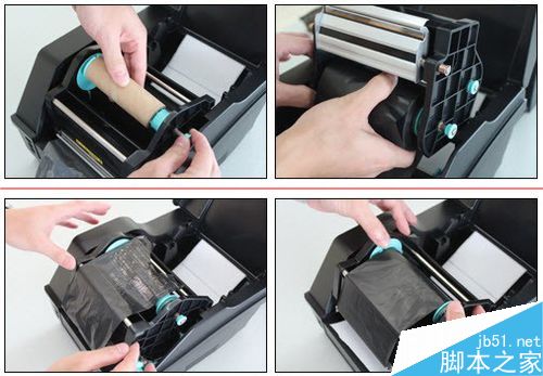 打開打印機(jī)上蓋,露出卷支倉(cāng),按下在打印機(jī)兩側(cè)的釋放鈕,打開打印頭摸組, 向上打開打印頭摸組露出碳帶供應(yīng)端,拆開碳帶包裝,取出碳帶和空卷芯,將條碼碳帶前端少量連接到空卷芯上。將碳帶安裝到碳帶供應(yīng)端(先卡左端在壓入右端),關(guān)上打印頭摸組在將空卷芯在碳帶回收端(先卡左端在壓入右端)。轉(zhuǎn)動(dòng)打印頭摸組左端的齒輪,確定碳帶卷緊,同時(shí)向下按壓打印頭摸組兩側(cè),直到聽到“咔噠”一聲。