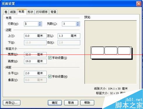 設(shè)置標(biāo)簽卷。指定標(biāo)簽卷的特性,選擇實(shí)際中標(biāo)簽的規(guī)格。如標(biāo)簽紙32*19*5000,應(yīng)選擇【多個(gè)標(biāo)簽列和/或行(M),行數(shù)【1】,列數(shù)【3】。