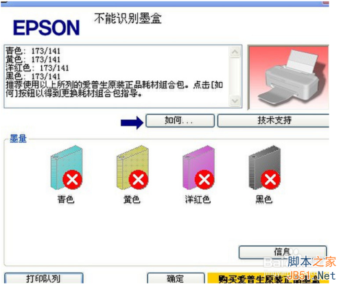 小編一臺愛普生打印機出現:黑色:T0491、青色:T0492、淡青色:T0495 、洋紅:T0493 、淡洋紅色:T0496 、黃色:T0494,全不識別墨盒如何處理呢?
