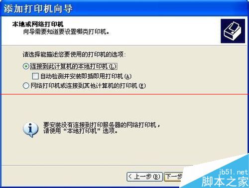 3、然后選擇 “連接到此計(jì)算機(jī)的本地打印機(jī)”,把自動(dòng)檢測(cè)并安裝即插即用打印機(jī) 勾去掉