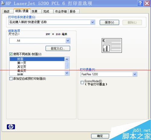 1、A:進入5200打印首選項當---紙張/質量,將使用不同紙張/封面選中(見下圖)