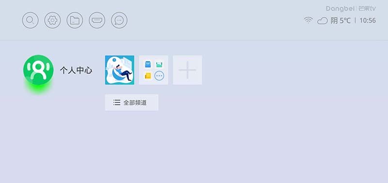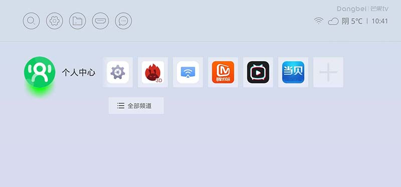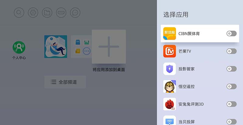 當(dāng)貝投影F1的UI界面最干凈的時刻。添加應(yīng)用點擊“➕”。