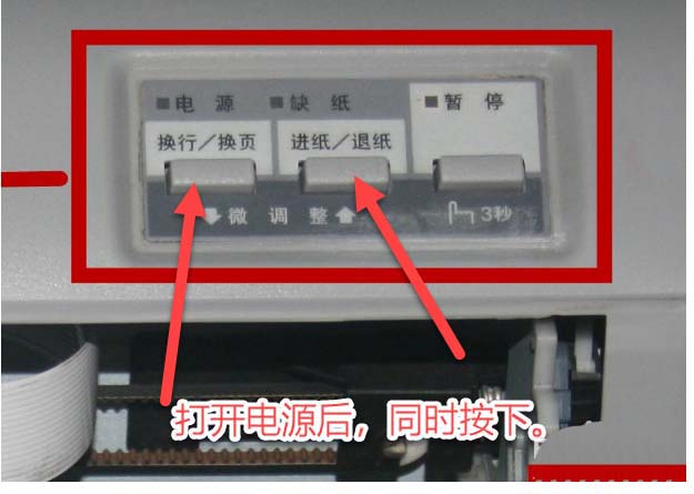 2、同時按住“進紙/退紙鍵”和“暫停鍵”然后打開打印機的電源,按住大概5s,等待打印頭開始移動后松手,打印機會打印出一頁文字。