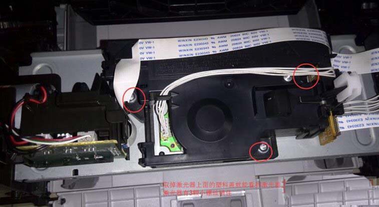 取掉激光器上面的塑料蓋,就能看到激光器了,激光器有三顆小螺絲鎖住