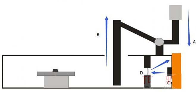 問題原理我已經做成一張示意圖,紅色箭頭的是正常的工作原理,藍色箭頭的是故障原理!(正常工作流程是A下壓,B上提,C處發射激光,經過D出鏡片到達四角菱片,四角菱片接到光束信號給主板信號)