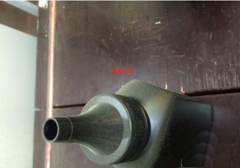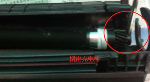 5、緊接著再用小型的一字螺絲刀把感光鼓封口輕輕往右邊撬,使得充電棍往外傾斜打開。